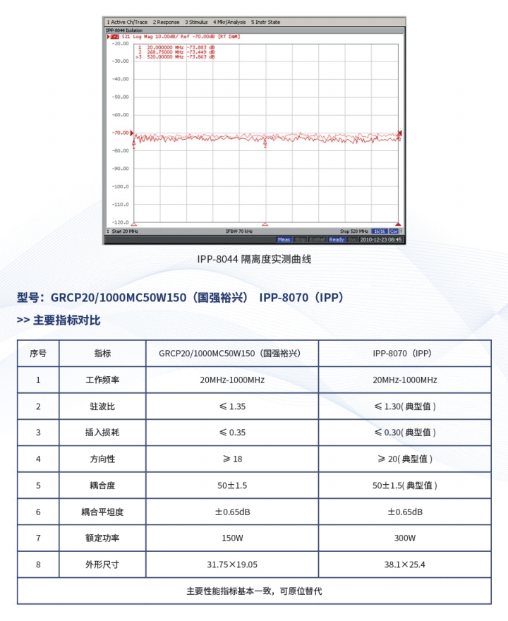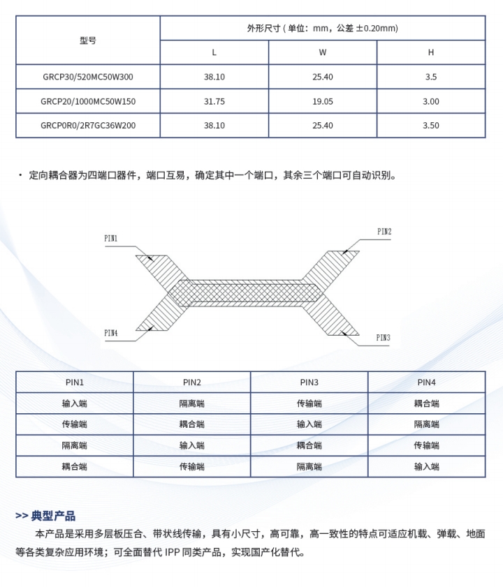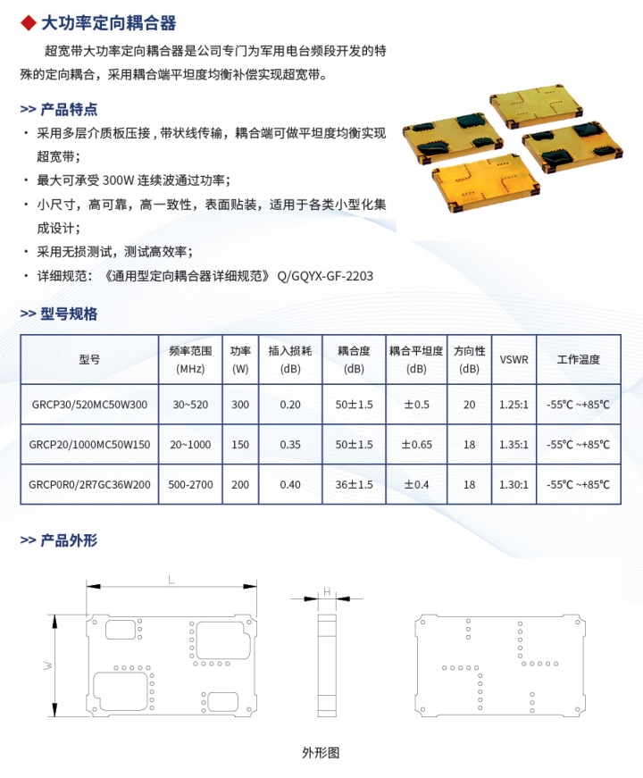 产品简介:超宽带大功率定向耦合器是公司专门为军用电台频段开发的特殊的定向耦合,采用耦合端平坦度均衡补偿实现超宽带。